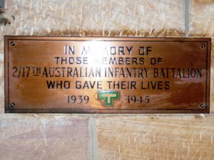 Very few at Splendour Rock would know where to look for a much smaller memorial to 2/17th Battalion of the WWII A.I.F.  (The ‘second’ Australian Imperial Force; A.I.F. was the Australian Army of WWII).  Why was this plaque installed to remember “MATES” of just one of many battalions of one of several Divisions raised in WWII?  Information from the Australian War Memorial (AWM) shows that during WWII the size of a battalion was modified but was still less than 800 men.