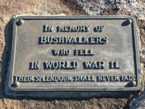 Splendour Rock at the southern end of Mt Dingo in the Megalong Valley is an outstanding location to remember bushwalkers who died in the armed services of WWII.  From Sydney Bush Walkers (SBW) records we know the names of the first bushwalkers to see this site and when its fabulous memorial was installed in 1948.  “The Bushwalker” archives at www.bushwalkingnsw.org.au describe the dedication service, led by Paddy Pallin, on ANZAC Day 1948.  For many recent years there has been a simple memorial service each ANZAC Day at Splendour Rock.  All bushwalkers should consider attending this moving service with its dry overnight camp at least once.