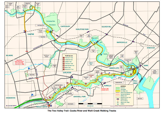 The Two Valley Trail is a loop walk along Cooks River and Wolli Creek, for a total length of about 12km. While many are familiar with the bicycle and pedestrian path following Cooks River, the bushland along Wolli Creek in this part of inner south west Sydney is less well known. Indeed it’s nothing short of a miracle that this gem has been preserved at all. If you would like to get to know it, come along on Sunday 6 August.