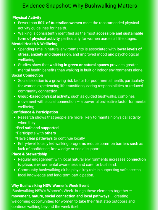 Bushwalking NSW’s Women’s Week brings these elements together — movement, nature, social connection and local pathways — creating welcoming opportunities for women to take their first step outdoors and continue walking beyond the week itself.